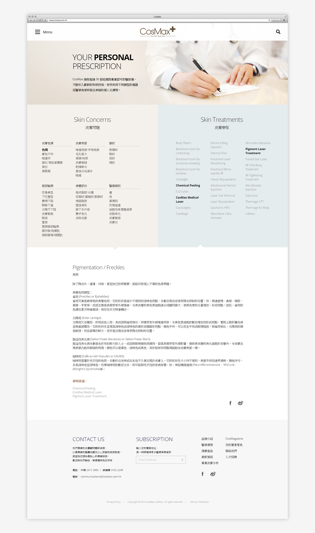 Founded by Dr. Lai Ying in 2005 and managed by Mrs Gigi Ma as the CEO, CosMax was established as one of the pioneers of medical laser skincare treatment. Clients are served by clinical professionals who provide treatments based on the client's unique conditions and personal medical records.